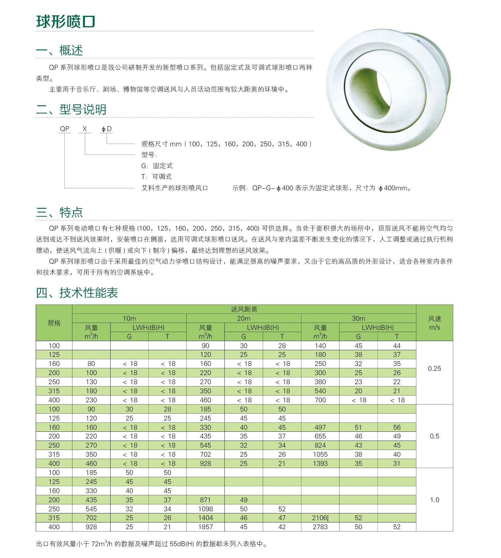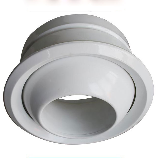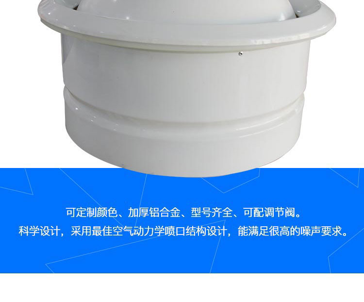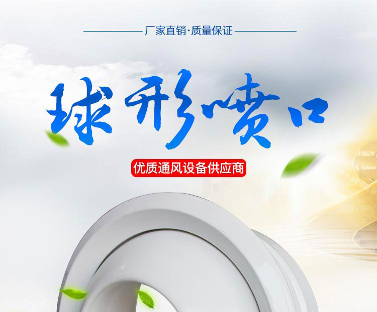 球形噴口由于采用最佳的空氣動力噴口結構設計,達到了理想的噪聲控制,由于它的高品質的外觀設計,所以廣泛應用于體育管、音樂廳、劇場、博物館、會議廳等高級場所。