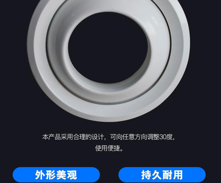 (電動球形噴口、溫控球形噴口)球形噴口主要用于空調送風口與人員活動范圍有較大距離的環境里。當公共場所(如到各種大廳及裝配間)面積很大時,利用天花板送風口不能將空氣均勻送到或達不到效果時,這種情況下就要安裝球形噴口在側面送風。在送風與室溫溫差不斷發生變化的情況下,送風氣流將向上(熱風)或向下(冷風)偏移。送風方向還可能受外部因素的干擾,如局部對流氣流或橫向氣流。因此,有些型號的球形噴口可設計成旋轉方式。