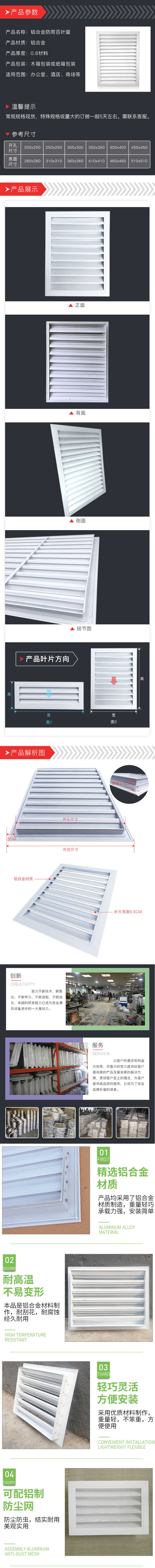 防雨百葉風(fēng)口(鋁合金防水百葉風(fēng)口)與回風(fēng)百葉風(fēng)口有相似的結(jié)構(gòu)和相同的性能,其葉片設(shè)計(jì)成獨(dú)特的形狀,具有防止水濺入內(nèi)部的功能,一般作安裝在外墻上的通風(fēng)口。