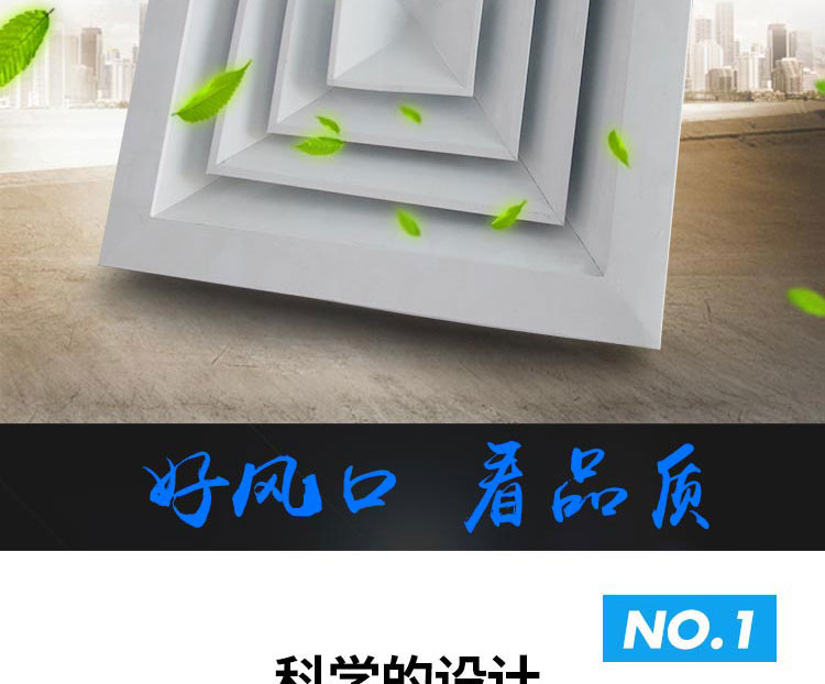 方形散流器(鋁合金散流器)優點及適用范圍:氣流屬貼附(平送)型,適用于播音室、醫院、劇場、教室、音樂廳、圖書館、游藝廳、劇場休息廳、一般辦公室、商店、旅館及體育館等。