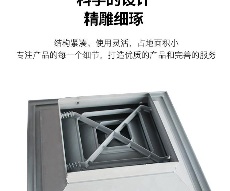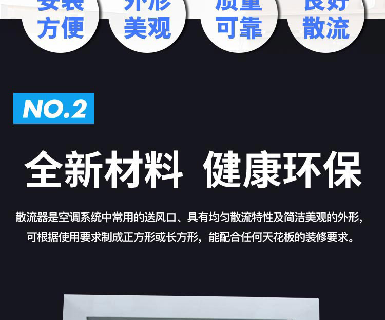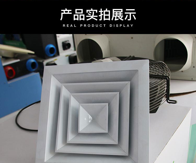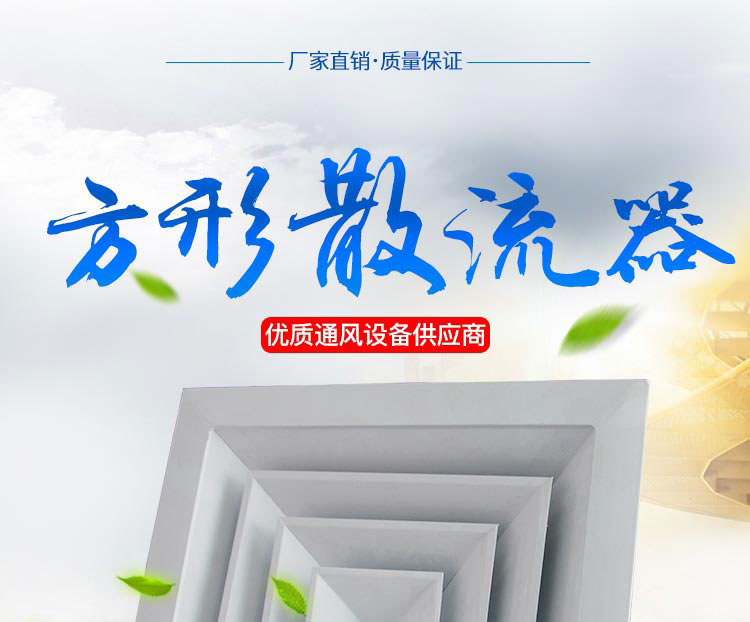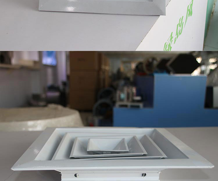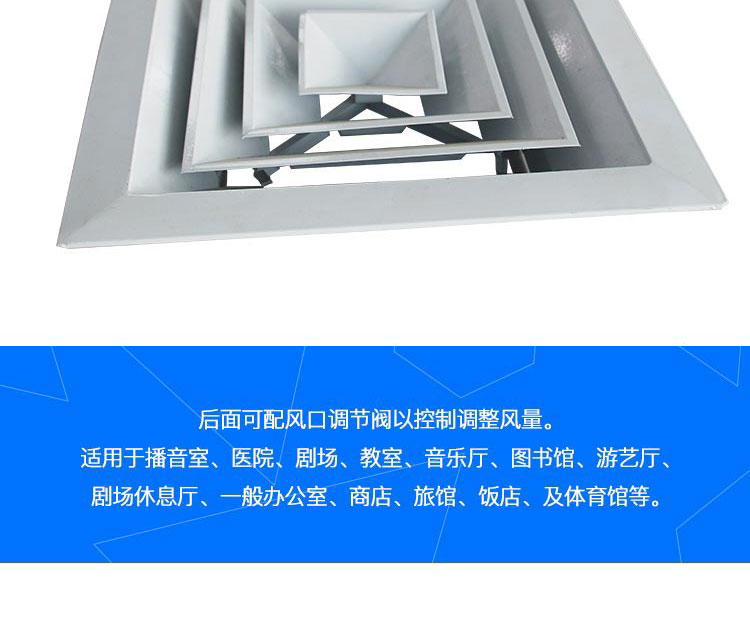 方型散流器使用該類型散流器時要與調節閥配合使用,才能在系統中得到理想的氣流分布。此風口的葉片角度為固定式,不能隨意調節,整個葉片與邊框采用分離結構
