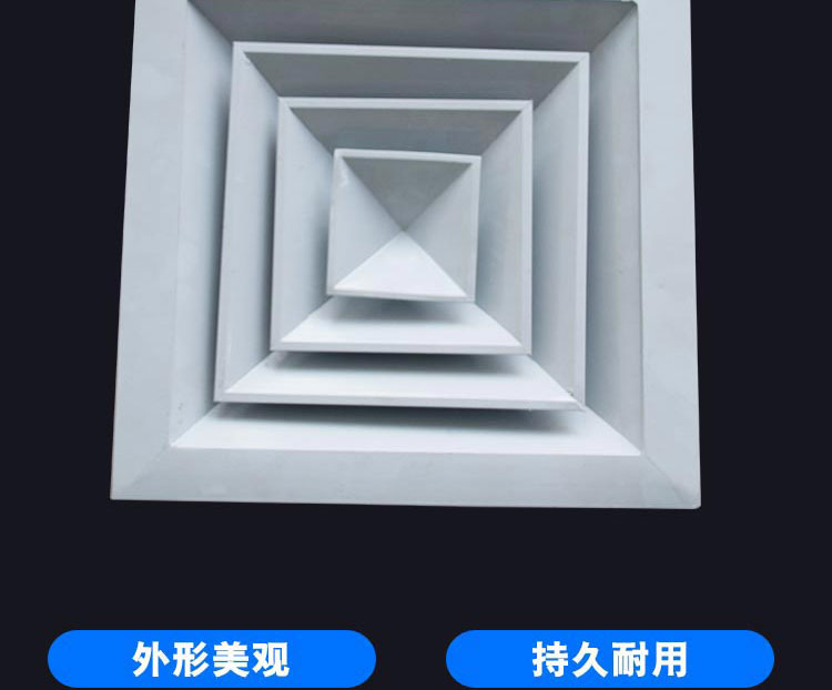 鋁質散流器外框和內芯采用優質金型材制作,并經本色陽極化處理,陽極化膜堅實耐腐蝕。也可根據用戶要求進行噴漆或著色處理。散流器外觀輪廓明顯,表面光潔明亮。本散流器,氣流屬貼附(平送)型。