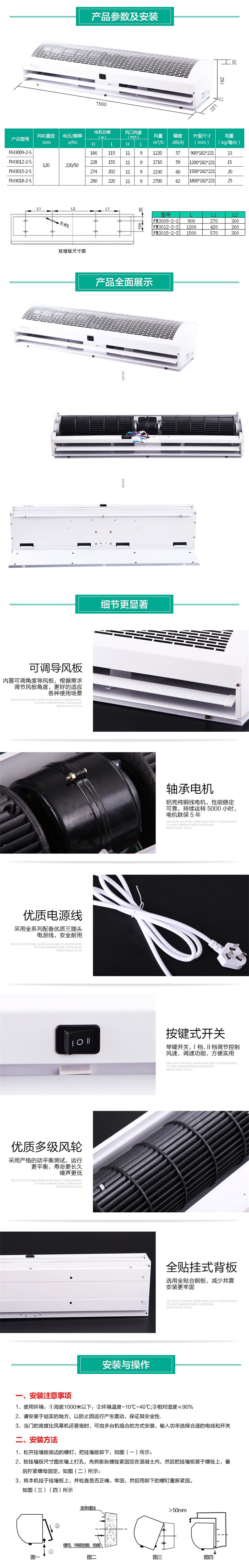 • 一、產品特點FM系列風幕機是采用單相電容運行式電動機驅動,帶動外形勻稱的貫流鋁合金風輪,或增強塑料風輪產生分布均勻的幕式氣流,可減少和阻隔室內外空氣對流。PFM-I系列熱風幕機里用電熱管通電原理產生熱···