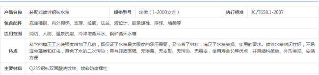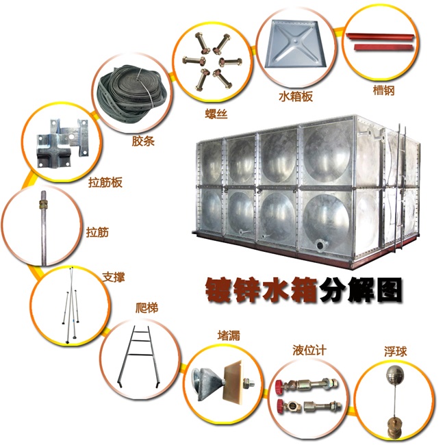 鍍鋅板水箱是按照02S101矩形給水箱圖集采用Q235鋼板制造生產的新型鋼板水箱,沖壓形成1000×1000和1000×500標準塊,四周鉆孔,經熱鍍鋅處理,現場進行安裝,組裝時標準塊之間夾無毒耐高溫橡膠墊,螺栓連接。制造、安裝均不受土建施工影響,不用焊接設備,表面采用熱鍍鋅防腐處理,美觀耐用,防止水質二次污染,并符合建筑產品標準化、系列化、工廠化要求。