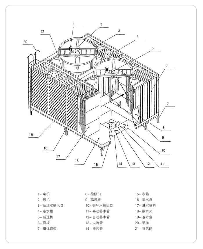 本系列冷卻塔為組合式設計,相鄰冷卻塔空氣室相互隔開,可在冷卻塔正常運轉的前提下,進行維護檢修,清洗填料、積水管和水箱的工作更加方便。