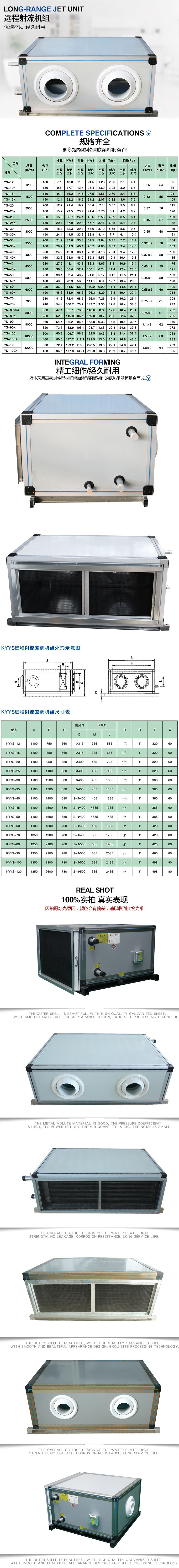 遠程射流空調機組主要由可調節變流形風口、換熱器、送排風機、過濾器、板式熱回收器及聯動式風量調節閥門構成。可調節變流形風口兼具球形噴口和旋流風口的特點,在實現遠距離送風的同時,又可滿足對氣流流形的調整;叉流式板式熱回收器可有效回收熱量,將空氣預熱;聯動式風量調節閥門可實現對空氣的風量調節。 遠程射流空調機組特點